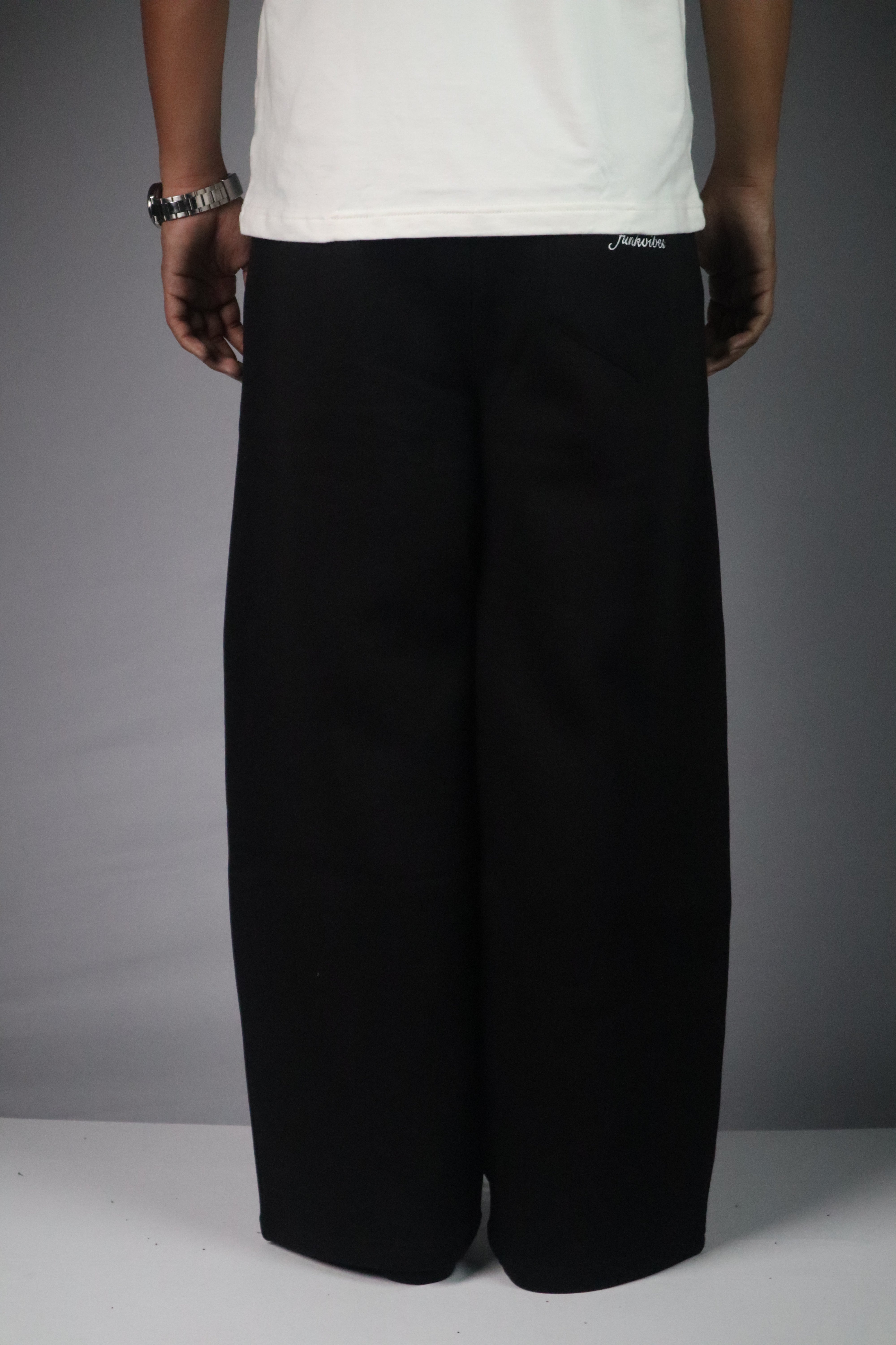 Designed with a relaxed wide-leg streetwear fit, these joggers provide maximum comfort while maintaining a bold minimal aesthetic. The deep black base combined with clean embroidery creates a versatile look that pairs perfectly with oversized tees, hoodies, or sweatshirts.